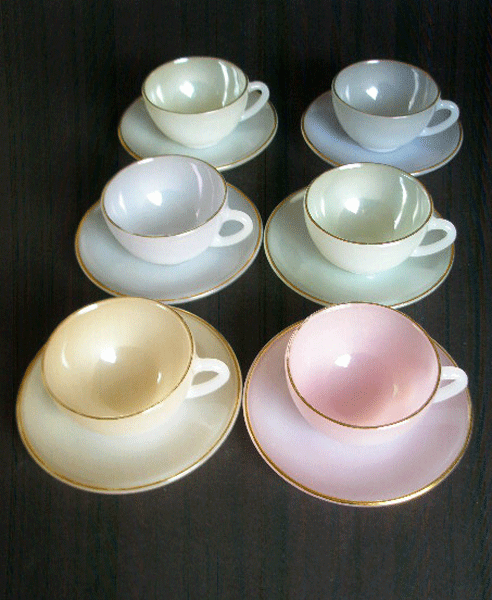 Dating to the 1960s are these six pretty French pastel lustre cups and saucers by Arcopal. They are in a strong opalescent glass, in different shades with a gold rim to cup and saucer. Lovely items and the colours look great stacked when not in use. Marked to the base of all pieces ARCOPAL FRANCE.