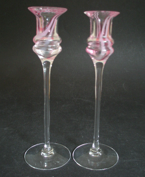 Dating to the late 1980s is this pair of Caithness Crystal Lynn candlesticks from a range designed by Colin Terris and Alastair MacIntosh. Initially made at Kings Lynn for Caithness, these are in the Charisma shape and the Dawn colourway of pink and ruby stripes. A very beautiful pair of candlesticks.