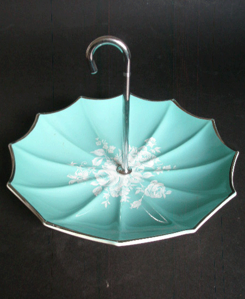 Dating to the early 1960s is this cake or bonbon plate by Midwinter. It is shaped like an umbrella, including the handle, and is in the Rhapsody pattern which is a white floral transfer set against a turquoise background. The handle unscrews for flat storage. Marked to the base MIDWINTER STYLECRAFT STAFFORDSHIRE ENGLAND FASHION SHAPE 8-59