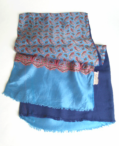 Dating to the 1960s is this Acetate Twill paisley scarf for men. It has a silky feel red, gold and blue paisley pattern on one side with a navy blue twill lining on the other side. It has very short fringing. The label reads ACETATE TWILL SCARF MADE IN MACCLESFIELD ENGLAND.