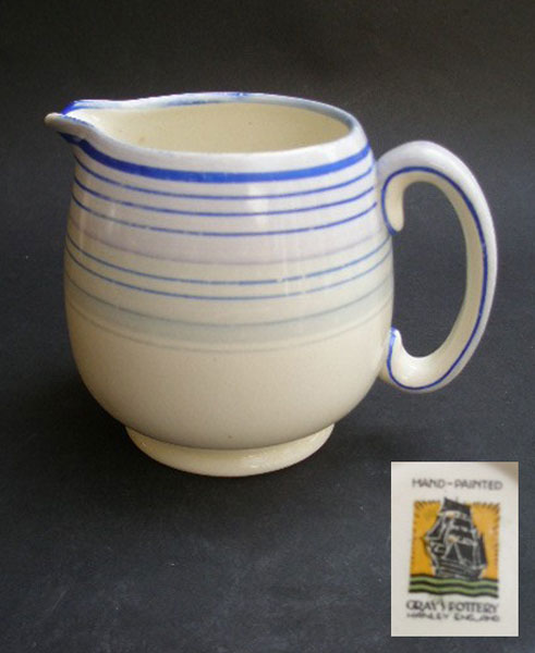 Here is a lovely handpainted jug by Gray's Pottery in simple bands of blue and grey.Lovely shape and suitable for milk or a posy of flowers. Marked to the base with the Clipper design and HAND-PAINTED GRAY'S POTTERY HANLEY ENGLAND plus painters initial and a number.