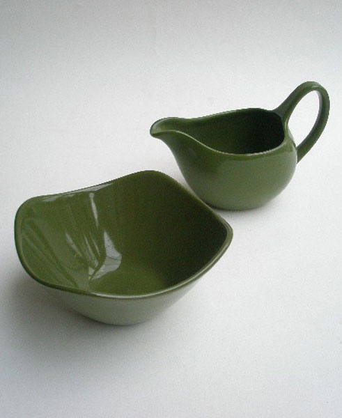 Dating to the 1950s is this Midwinter milk jug and sugar bowl. These were designed by John Russell as part of the Riverside collection but can easily be mixed with other crockery for a very retro look. Very angular shape and a deep olive green colour.