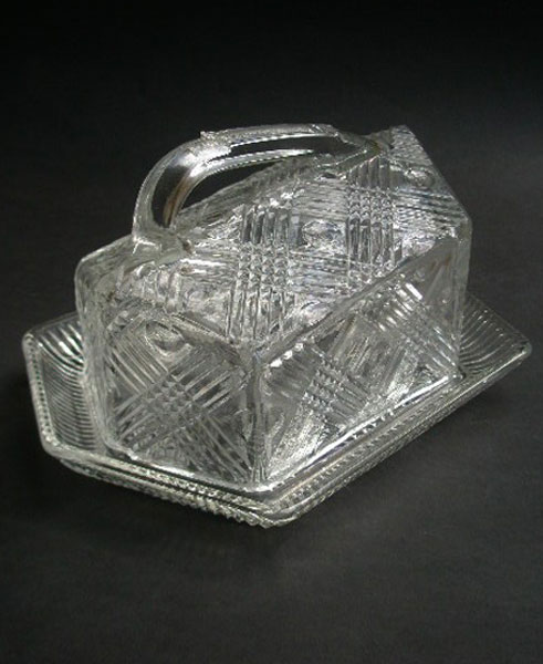 Here is a large pressed glass cheese dish by Chance Glass in the Britannia pattern. This pattern was brought out in 1949 and has the appearance of cut-glass showing the high quality of pressing by Chance glass at the time.This is a sought after item.Lovely unusual, angular shape. Has airholes either side of lid at base to let the cheese breathe.