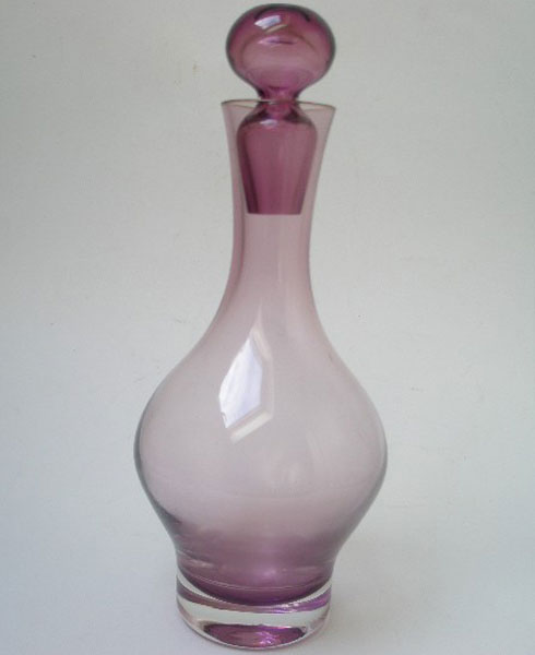 Dating to the 1960s is this beautiful decanter by Caithness glass. Designed by Domhnall O Broin, who was much influenced by Scandinavian glass at that time, it forms part of the Canisbay range. Colours were influenced by the Scottish landscape and this one is in the Heather colourway.It has a flat top hollow stopper. A very heavy,stunning, quality decanter.