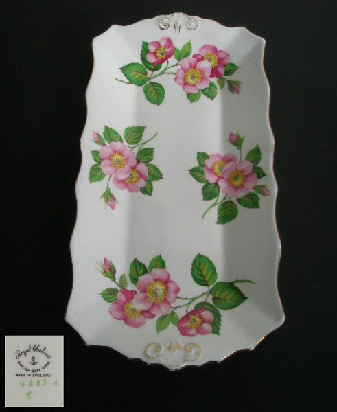 Here is a Bone China plate by Royal Chelsea with a beautiful design of Dog Roses. It has a scalloped edge with gilding and is perfect for serving sandwiches or cake.Marked to the base Royal Chelsea ENGLISH BONE CHINA MADE IN ENGLAND.There is a painted green number and painters initial.