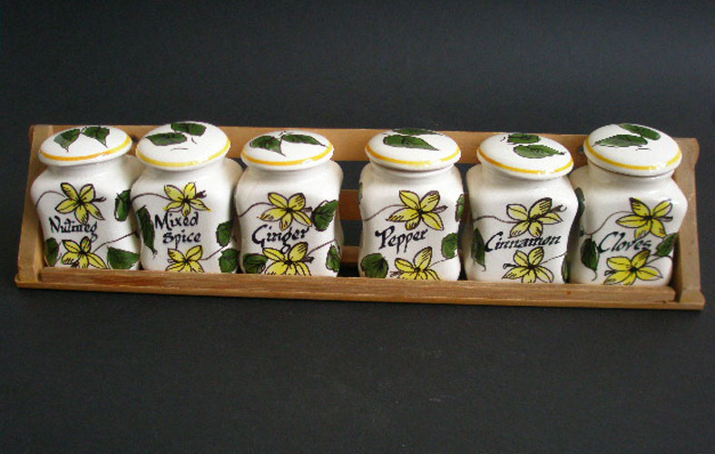 Dating to the 1960s is this set of herb jars from the Toni Raymond Pottery. They are handpainted in the yellow flower design and are in a wooden stand which can be fixed to the wall.The pottery lids have cork to the underside for tight fitting. Marked to the front nutmeg, mixed spice,ginger,pepper cinnamon,cloves and to the base of each one TONI RAYMOND POTTERY ENGLAND