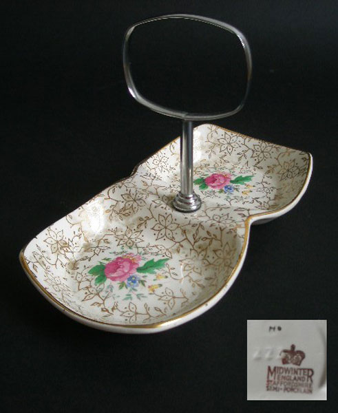 This is a 1950s Midwinter two compartment,semi-porcelaine jam dish in the Chintz design. It has a central chrome handle which unscrews for easy storage and cleaning.It could be used for butter and jam for serving scones or with toast. Marked to the basein gold with a crown MIDWINTER ENGLAND STAFFORDSHIRE and the painters initial, plus impressed numbers.
