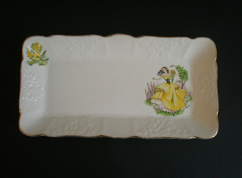 Dating to the 1950s is this long sandwich or cake plate with a design of a young lady in a country garden.It has the title written as Dainty Miss. Marked to the base ENGLAND 3-59 and the painters initial and moulded number 320.