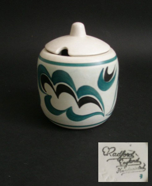 Here is a lidded preserve pot by Radford in a lovely matt white glaze with a handpainted stylised leaf design in deep turquoise and black. It has an opening in the lid for a spoon.Marked to the base Radford England Handpainted. E for painters initial and impressed number 837.