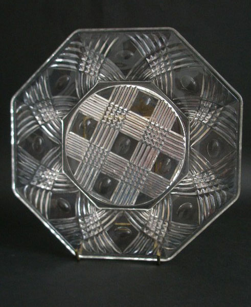 Here is an octagonal pressed glass plate by Chance Glass in the Britannia pattern. This pattern was brought out in 1949 and has the appearance of cut-glass showing the high quality of pressing by Chance glass at the time.This is a sought after pattern and a good example of early chance glass.