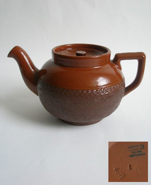 Dating to the 1920s/30s is this lovely rich brown glazed earthenware teapot by Langley. It has a texture to the lower part of the body in a deeper brown which matches the colour of the lid, which has a steam hole. This is a traditional shape and holds one and a half pints. Marked to the base in print DENBY LTD LANGLEY ENGLAND and impressed L and 1 1/2 PT