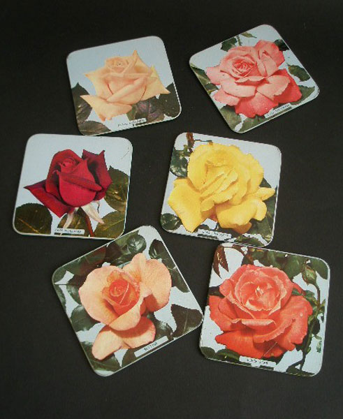 Dating to the 1960s is this set of six coasters each displaying a different rose. They are printed on a metal surface and sealed to a cork base. Each one names the rose ROYAL HIGHNESS, SUPER STAR, BETTINA, PAPA MEILLAND, PRIMA BALLERINA and KING RANSOM. These are suitable for the dinner table or scattered for other ocassions.