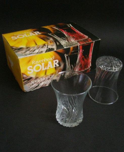 Here is a boxed set of six 14cl spirit or juice glasses by Ravenhead.They are in the Solar pattern designed in 1972 by Annette Meech. The design displays sun rays on the base and twisted as they come up the glass. Very retro and still in the original retro box. These would make a great gift. Marked to the box RAVENHEAD SOLAR SPIRIT/JUICE GLASS VERRE A JUS / WHISKY.