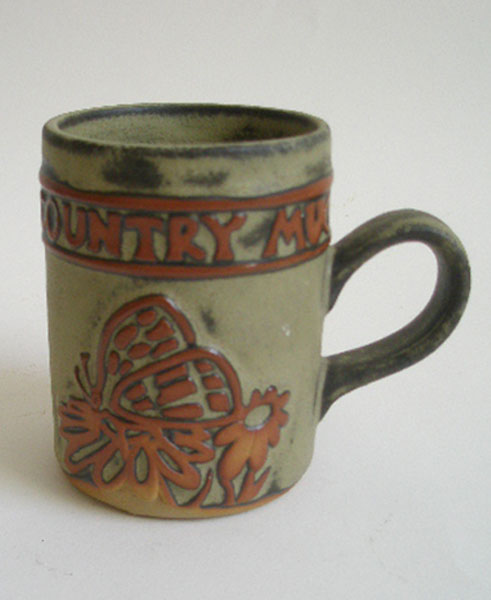 Dating to the 1960s is this Studio pottery mug produced by Tremar of Cornwall. Very unusual matt glaze. This one has the butterfly on a flower in relief design back and front and COUNTRY MUG to the top.Impressed to the base TREMAR.
