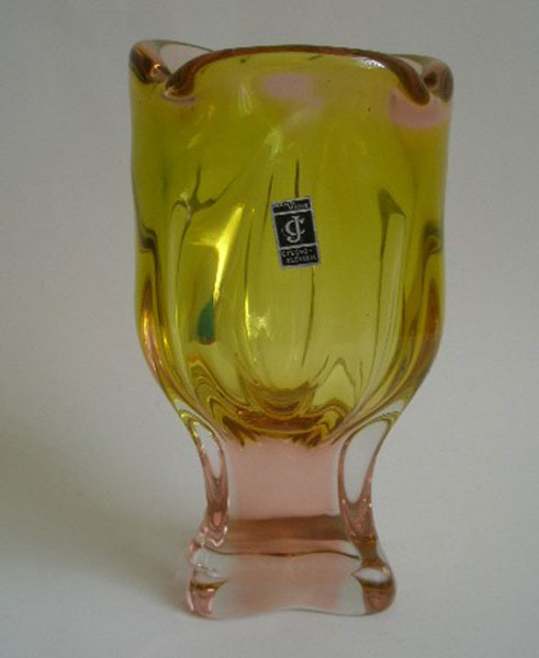 This is a fabulous heavy glass vase designed by Josef Hospodka for Chribska. It is in pink and yellowy green and in a sculptural organic shape. The base is narrower in width to enable it to sit on a mantle or shelf. This still has the original paper label stating HAND MADE CZECHOSLOVAKIA and J C monogram for Jones &Co who were British importers of Bohemian glassware at that time.