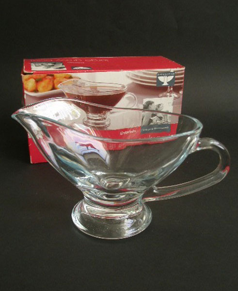 Here is a large gravy or sauce boat manufactured by the renowned Ravenhead glass.This has not been used and is still in the original box. Marked to the box RAVENHEAD and the logo and large gravy boat.