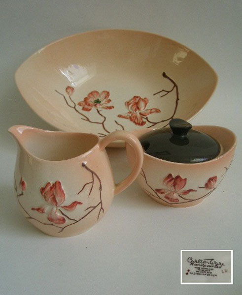 Dating to the 1950s is this Carlton Ware set consisting of a Serving bowl and cream jug and sugar bowl. They are all in the Magnolia design on a pink background. They came together and would make a great set for serving strawberries and cream or any similar dessert. Marked to the base Carlton Ware HANDPAINTED MADE IN ENGLAND 'TRADE MARK REGISTERED AUSTRALIAN DESIGN