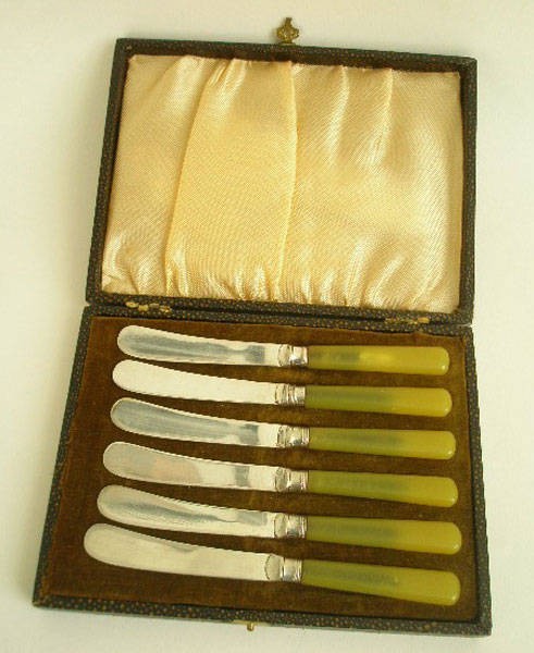 This is a lovely set of six tea/ butter knives with ochre bakelite handles and silver plated rounded blades.These are in the original brown velvet lined box. Marked to the blades E.P.N.S.