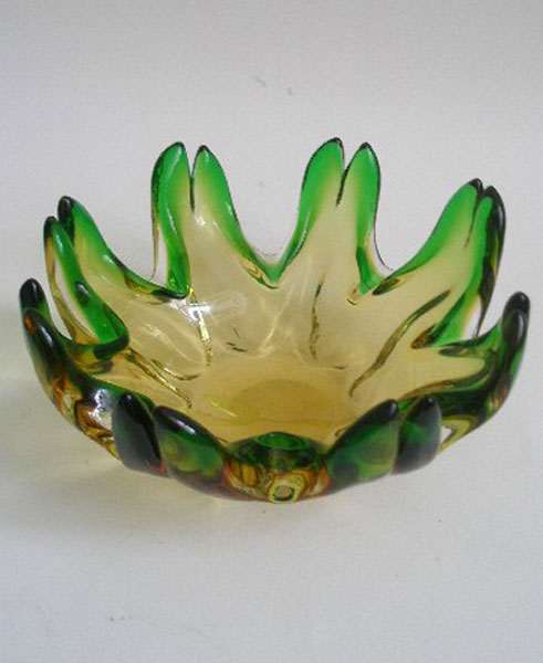 A beautiful Green/yellow Bohemian Art glass dish designed by Josef Hospodka for Chribska. This has crab claw shaped edges and is in a rich green colour turning to a lighter green yellow to the centre. This is a stunning piece of quality glass.