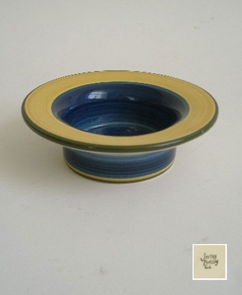 Here is a lovely candleholder by Jersey Pottery. It has been handpainted in deep blue and sand yellow with a green rim and is suitable for a pillar candle with a diameter of 2.5 inches. It is also attractive to use as a pin dish. Marked to the base Jersey Pottery C.I.and a 'D' for the painters initial.
