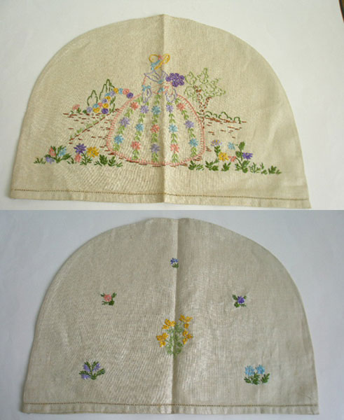 Here is a hand embroidered linen tea cosy to cover a pad. It has a crinoline lady in a garden to one side and flowers to the other side.