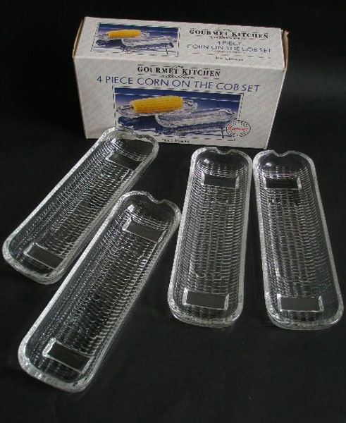 Here is a four piece corn on the cob set by Rayware. It is part of The Gourmet Kitchen collection of fine glassware. These stack well when not in use and are still in their original box and have not been used.