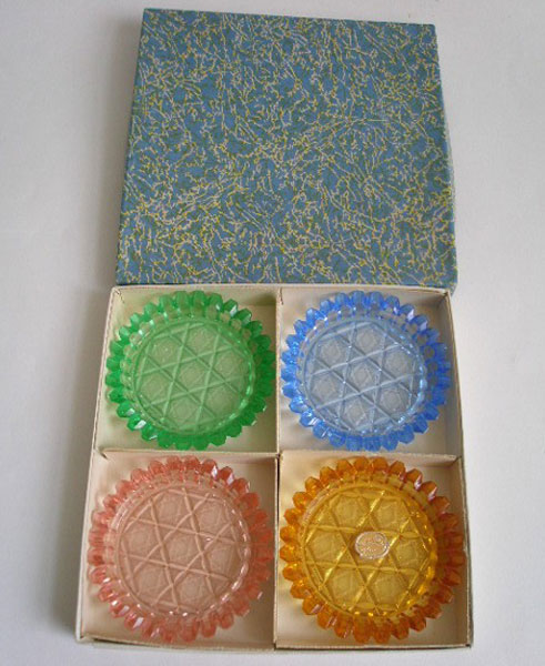 Dating to the 1960s is this set of four small glass dishes. They are in different colours (pink,orange,blue and green. They are in the original box and one still has the 1960s Bohemia sticker.