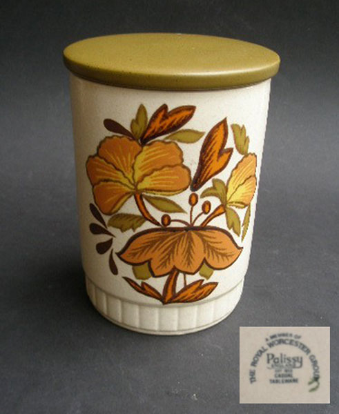 in the Kismet design. It has a greenish brown tight fitting rubber sealed lid which makes it perfect for storing food stuffs for freshness. A nice retro piece. Marked to the base A MEMBER OF THE ROYAL WORCESTER GROUP Palissy ENGLAND EST 1852 CASUAL TABLEWARE.