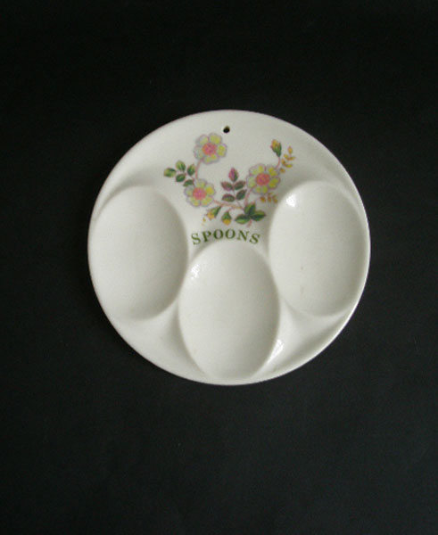 This is a St. Michael spoon rest in the Autumn Leaves design. It has three indents for spoons and a hole for hanging when not in use.