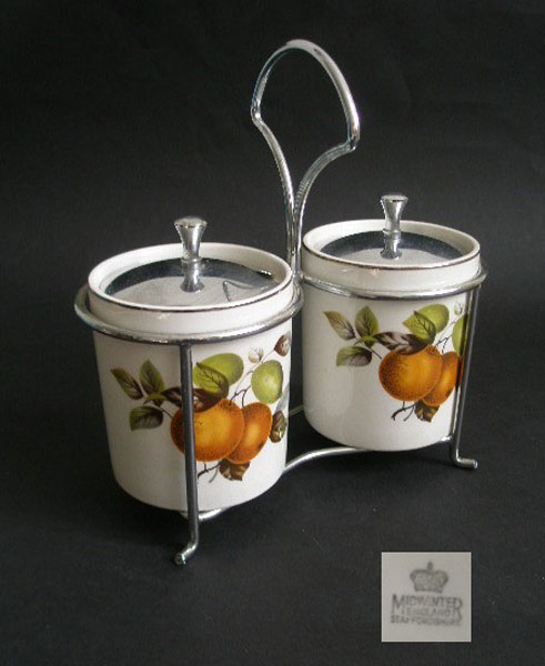 Here is a pair of conserve or jam pots by Midwinter pottery in Oranges and Lemons design. It dates to the 1960s and is on the Stylecraft shape. The pots have chrome plated lids with an opening for a spoon and sit neatly in a chrome plated carrying stand. Great for carrying to the table and offering a choice of preserve. Marked to the base of the pots MIDWINTER ENGLAND STAFFORDSHIRE.