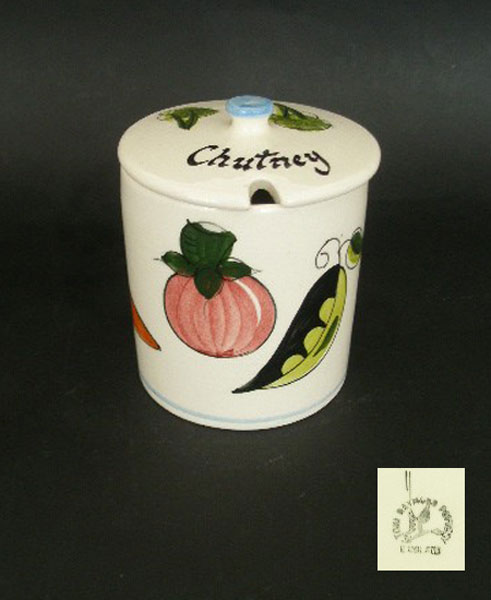 Dating to the 1960s is this lidded pot by Toni Raymond Pottery. It is handpainted with vegetables and labelled on the lid 'Chutney' It also has an opening for a spoon. Marked to the base TONI RAYMOND POTTERY ENGLAND.