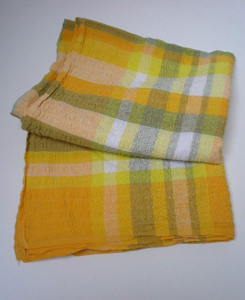 Dating to the 1960s is this square, seersucker cotton tablecloth in an overlapping checked pattern of yellow,orange and olive green and grey, making various other shades. Great for picnics or breakfast table.