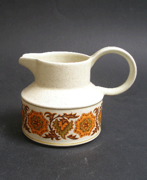 Dating to 1972 is this Midwinter Pottery milk/cream jug. It is in the Woodland pattern designed by the renowned Jessie Tait and it consists of eight-sided floral and leaf motifs in orange with brown and olive detail on a matt beige background. This is part of the Stonehenge range. Impressed to the base MIDWINTER ENGLAND