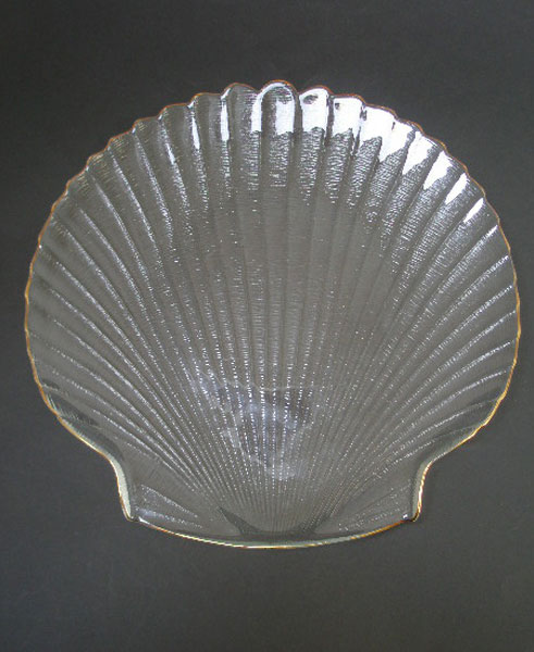 Here is a large serving platter in the shape of a scallop by Arcoroc of France. It is in a tempered glass and has a gilded edge. Great for serving fish canapes etc. Marked to the underside of the glass FRANCE