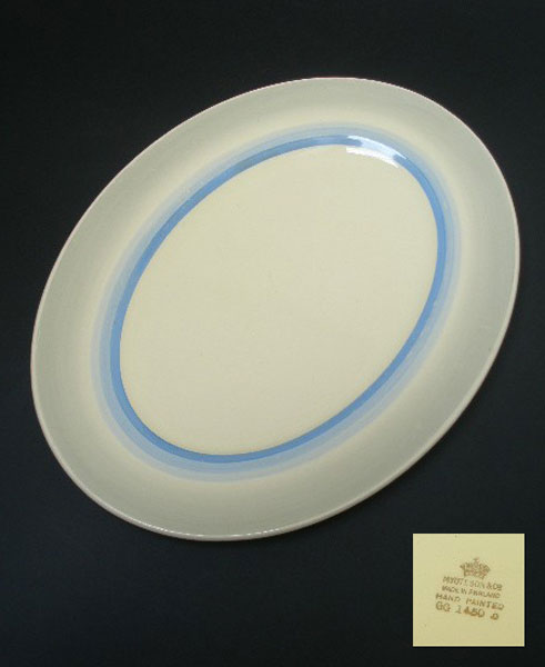 Here is a 1930s oval serving plate by Myott which has been hand-painted in blues on a cream glaze. Marked to the base with the crown MYOTT SON & Co. MADE IN ENGLAND HAND PAINTED GG 1450 B