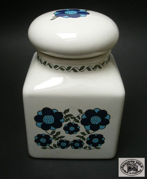 A lovely retro ceramic kitchen storage jar in the blue stylised flower design by Taunton Vale pottery. This is on a square base which tapers in at the top to form a circle on which sits a squashed dome shaped lid also decorated with a flower.This is the large size. Marked to the base TAUNTON VALE Made in England. Fabulous chunky piece of retro kitchenalia!