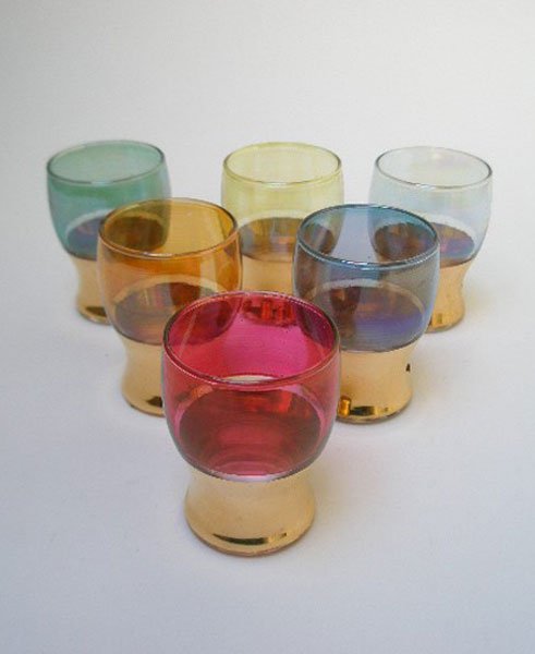 Dating to the 1950s is this set of six small glasses. They could be used for sherry or port or as shot glasses. Each glass is in a different colour with the lower part blocked in gilt. Very festive.