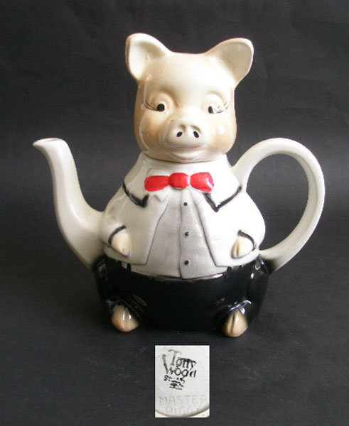 Here is a superb figurative teapot from the Tony Wood Studios which, with Will Blandford as the main modeller, became famous for the range of novelty teapots such as this 'Master Piggy' that are so collected today. Tony Wood was a direct descendant of Ralph Wood of Wood and Son Staffordshire[established potters since late 18th century] and he established his own pottery between 1980 and the early to mid 90's. The pig's head comes off as the lid and his body is dressed in a white shirt and jacket smartened up with a red bow tie. At the rear he has a cute curly tail. This fabulous item will appeal to teapot and pig collectors or make an unusual gift. Marked to the base with H J WOOD ENGLAND MASTER PIGGY TONY WOOD [in black under the glaze]. There is one other 'L' shaped mark.