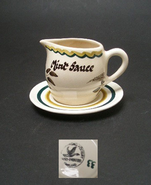 Dating to the 1960s is this handpainted Mint Sauce jug with saucer by Toni Raymond.It is in black, green and ochre on a white ground. Marked to the base of both pieces TONI RAYMOND POTTERY ENGLAND