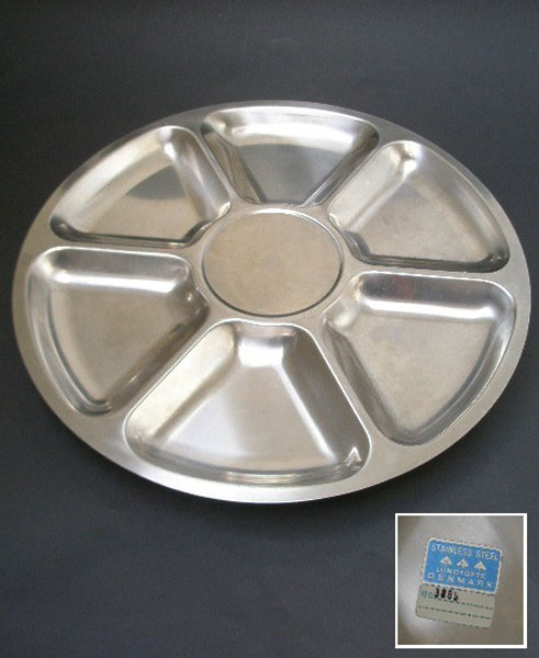 Dating to the 1960s is this large stainless steel revolving Hors D Oeuvres tray by Lundtofte of Denmark. It has six sections and a central space for a dip. This still has the original STAINLESS STEEL LUNDTOFTE DENMARK and marked to the underside also.