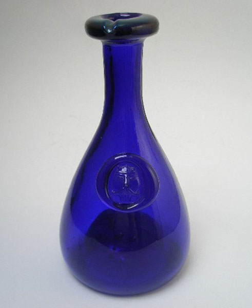 Here is an original blue Viking carafe designed by Danish Ole Winther in 1955 for Holmegaard. It has a stylised viking head embossed into the applied glass medallion.This series of carafes was auto-blown and made to resemble ancient handmade glass and so encompasses internal bubbles and external ripples in the glass. It has a hand-formed lustred pouring spout and a hand-pressed seal.This carafe was discontinued in 1976.