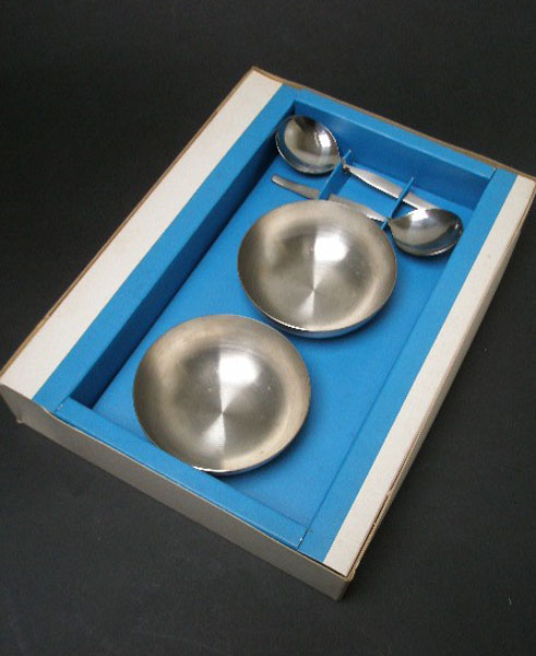 Dating to the 1970s is this 4 piece Sundae Set by Viners. It consists of 2 Sundae Cups with circular base and 2 fruit spoons. These are still in the original box. Date on box is 16/1/73.