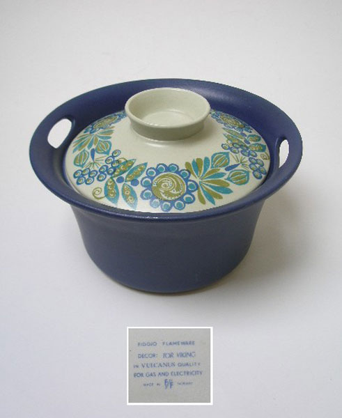 Dating to the 1970s is this casserole dish by Figgjo Flint of Norway. It is in the Tor Viking design by Turi Gramstad-Oliver. This wonderful Turi design is a stylised blue and green flower and the main body in dark blue.It is suitable for use on a gas or electric hob. Marked to the underside of the lid FIGGJO FLAMEWARE DECOR; TOR VIKING IN VULCANUS QUALITY FOR GAS AND ELECTRICITY MADE IN FF NORWAY.