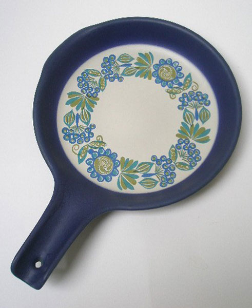Dating to the 1970s is this skillet pan by Figgjo Flint of Norway. It is in the Tor Viking design by Turi Gramstad-Oliver. This wonderful Turi design is a stylised blue and green flower and the main body in dark blue.It has a hole in the handle making it suitable for hanging and is suitable for use on a gas or electric hob. Marked to the underside FIGGJO FLAMEWARE DECOR; TOR VIKING IN VULCANUS QUALITY FOR GAS AND ELECTRICITY MADE IN FF NORWAY.Impressed number 12227