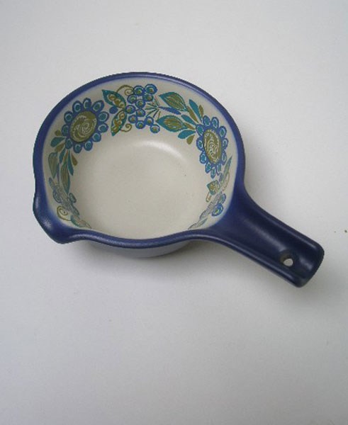 Dating to the 1970s is this small pan suitable for boiling milk or making a sauce. It is by Figgjo Flint of Norway and in the Tor Viking design by Turi Gramstad-Oliver. This wonderful Turi design is a stylised blue and green flower and the main body in dark blue.It has a hole in the handle making it suitable for hanging and can be used on a gas or electric hob. Marked to the underside FIGGJO FLAMEWARE DECOR; TOR VIKING IN VULCANUS QUALITY FOR GAS AND ELECTRICITY MADE IN FF NORWAY.Impressed number 12217