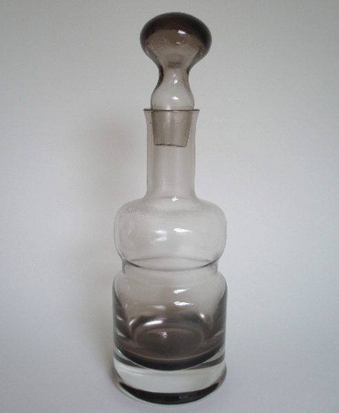 Dating to the 1970s is this Caithness Glass decanter in the peat colourway. It was designed by Colin Terris and has a waisted body allowing the decanter to be gripped safely. A beautiful,quality piece of glass.
