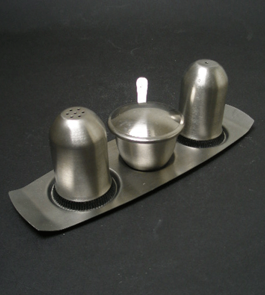 Dating to the 1960s is this four piece stainless steel cruet set. It is in a matt finish and comprises of salt, pepper and mustard pot with spoon and all on a neat stand. This is still in the original covering and has not been used.