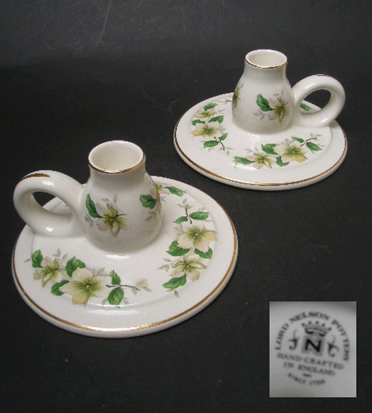 Here is a pretty pair of candlesticks by Lord Nelson Pottery. They are in a white glaze with a gilded edge and rim and have a creamy white blossom design to them. Marked to the base LORD NELSON POTTERY HAND-CRAFTED IN ENGLAND 3708