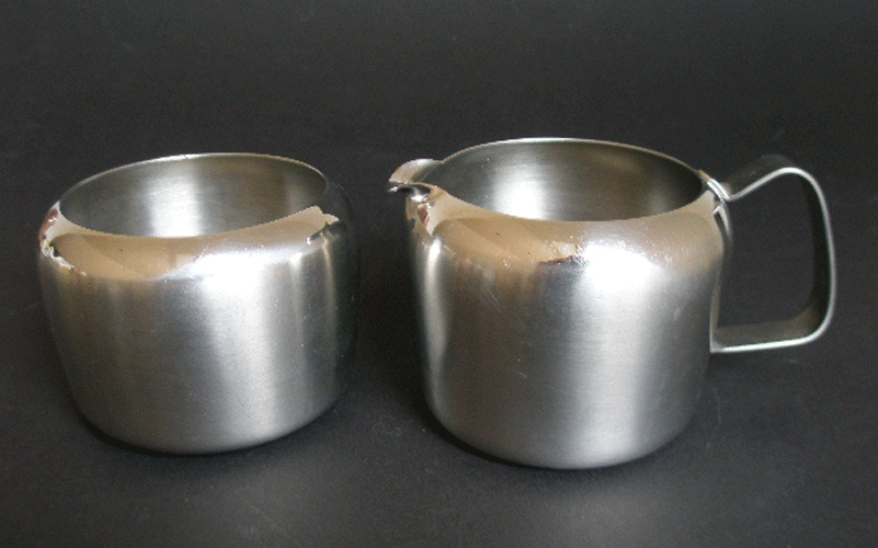 Dating to the 1960s is this stainless steel milk and sugar set by Old Hall. It is in a matt satin finish with a bright shiny rim to both pieces and a shiny handle to the jug.