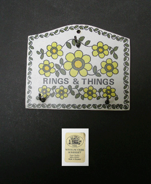 Dating to the 1970s is this Taunton Vale melamine hook rack. It has the yellow flower design with three metal hooks and a hole for wall mounting. The front is dated 1972. This has RINGS & THINGS written on the front and was designed to hang your rings, wrist watch and other jewellery whilst washing up or cleaning. Marked to the back with the original sticker TAUNTON VALE WIVELISCOMBE Finest Quality MELAMINE Made in England.
